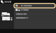 注册了默认纸张设置后,装入纸张时将不会显示纸张设置画面,并且将一直使用相同的设置。如果在未改变纸张设置的情况下装入不同尺寸或类型的纸张,本机可能无法正常打印。为了避免此问题,请在步骤 3 中选择 <装入纸张时指定>,然后再装入纸张。 |