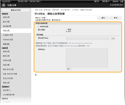 2 | 指定例外地址。 在 [要注册的地址] 文本框中输入 IP 地址(或 IP 地址范围),然后单击 [添加]。 检查是否有输入错误 IP 地址输入形式 | 说明 | 示例 | 输入单个地址 | IPv4: 用点分隔数字。 | 192.168.0.10 | IPv6: 用冒号分隔字母数字字符。 | fe80::10 | 指定地址范围 | 在地址之间插入连字符。 | 192.168.0.10-192.168.0.20 | 指定具有前缀的地址范围 | 输入地址,然后输入斜杠和表示前缀长度的数字。 | 192.168.0.32/27 fe80::1234/64 |