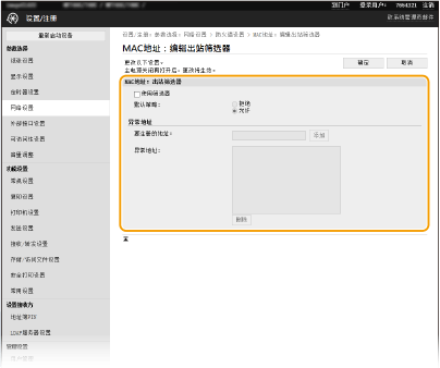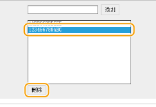 2 | 指定例外地址。 在 [要注册的地址] 文本框中输入 MAC 地址,然后单击 [添加]。 无需用连字符或冒号分隔地址。 ![]() 检查是否有输入错误 如果错误输入 MAC 地址,则可能无法从远程用户界面访问本机,此时需要将 <MAC地址筛选器> 设置为 <关闭>。 <MAC地址筛选器> ![]() 当出站筛选器选择 [拒绝] 时 无法过滤发出的多路传送和广播包。 从例外中删除 MAC 地址 选择一个 MAC 地址,然后单击 [删除]。 ![]() | ||||