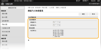 您可以通过传输层安全性 (TLS) 加密本机和计算机上网页浏览器之间的通信。TLS 加密机制用于通过网络发送或接收的数据。当远程用户界面用于指定 IPSec(预共享密钥方法)、IEEE 802.1X 认证 (TTLS/PEAP) 或 SNMPv3 的设置时,必须启用 TLS。若要对远程用户界面使用 TLS 加密通信,需要在启用 TLS 之前指定要使用的“密钥和证书”。启用 TLS 之前,请生成或安装用于 TLS 的密钥和证书(