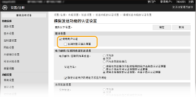 [使用设备指定的认证信息,并且不显示认证屏幕] | 发送电子邮件或 I-Fax 时不显示认证画面。SMTP 服务器上的认证将使用 [电子邮件/互联网传真设置] 配置电子邮件/I-Fax 通信设置 中设置的用户名和密码执行。 |