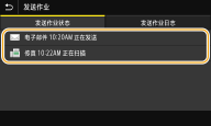 检查发送文档的状态1 | 在 <发送作业状态> 选项卡中选择您要检查状态的文档。 ![]() 显示关于文档的详细信息。 如果指定了多个接收方,画面上将显示指定的接收方数量。要查看指定的多个接收方的详细信息,请选择 <接收方>。 |