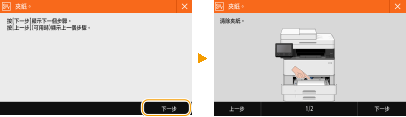 發生錯誤時,在某些情況下,會顯示如何回應錯誤的指示。請遵循畫面上的指示解決問題。下圖以發生卡紙時顯示的畫面為例說明。