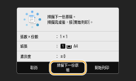 1 | 將下一份原稿放在原稿台玻璃上,然後選擇 <掃描下一份原稿>。 您也可以針對每個原稿分別指定 <濃淡度> 和 <原稿類型>。 ![]() 重複此步驟,直到整個原稿都完成掃描。 |