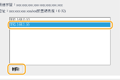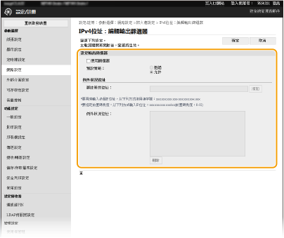 2 | 指定例外位址。 在 [要註冊的位址] 文字框中輸入 IP 位址(或 IP 位址的範圍),然後按一下 [添加]。 檢查是否輸入錯誤 IP 位址的輸入形式 | 描述 | 範例 | 輸入單一位址 | IPv4: 以句點分隔號碼。 | 192.168.0.10 | IPv6: 以冒號分隔英數字元。 | fe80::10 | 指定位址範圍 | 在位址之間插入連字號。 | 192.168.0.10-192.168.0.20 | 以前置碼指定位址範圍 | 輸入位址,接著輸入斜線和表示前置碼長度的號碼。 | 192.168.0.32/27 fe80::1234/64 |