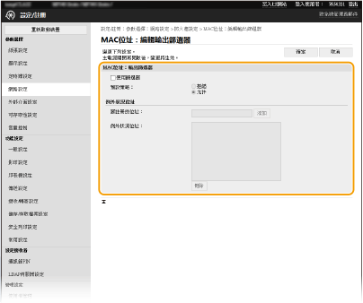 如果輸入錯誤的 MAC 位址,可能無法從遠端使用者介面存取本機,在此情況下必須將 <MAC位址篩選器> 設為 <關閉>。 <MAC位址篩選器>