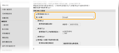 1 | 勾選 [使用TTLS] 或 [使用PEAP] 核取方塊。 TTLS 的內部通訊協定 可以選擇 MSCHAPv2 或 PAP。 |