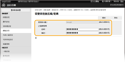 3 | 設定使用者名稱/密碼。 [使用者名稱] 輸入使用者名稱的英數字元。 [變更密碼] 若要設定或變更密碼,請勾選核取方塊並在 [密碼] 和 [確認] 文字方塊中輸入新密碼的英數字元。 |
