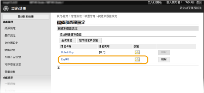 無法刪除正在使用的鍵値和憑證,例如「[TLS]」或「[IEEE 802.1X]」出現在 [鍵值使用] 下方時。在這種情況下,請先停用此功能或更換鍵値和憑證,然後再加以刪除。