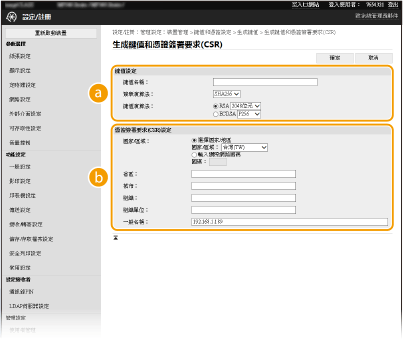 由於本機產生的憑證沒有 CA 簽章,根據其所通訊的設備而定,可能會造成通訊錯誤。若要具備憑證授權單位簽發的具有 CA 簽章的憑證,必須取得 CSR(憑證簽署要求)資料;管理員可從遠端使用者介面產生。當憑證簽發後,請將它與所產生的 CSR 一起註冊到鍵值。