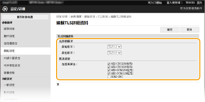您可以使用傳輸層安全性 (TLS) 為本機與電腦網路瀏覽器之間的通訊加密。TLS 是為透過網路傳送或接收的資料加密的機制。使用遠端使用者介面指定 IPSec(預共用鍵值方法)、IEEE 802.1X 認證 (TTLS/PEAP) 或 SNMPv3 的設定時,必須啟用 TLS。若要為遠端使用者介面使用 TLS 加密通訊,必須先指定您要使用的「鍵値和憑證」(伺服器憑證),然後才啟用 TLS。啟用 TLS 前先為 TLS 產生或安裝鍵値和憑證(