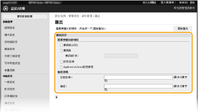 輸入英數字元的密碼,以便加密匯出資料。在 [確認] 中輸入相同密碼。如果勾選 [通訊錄] 或 [設定/註冊] 核取方塊,無法在未設定匯出密碼的情況下匯出資料。