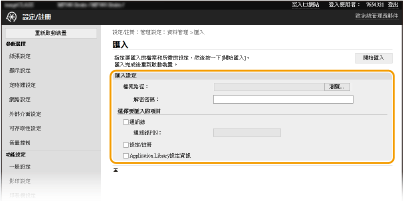 按一下 [瀏覽] 並選擇檔案。您僅能匯入裝置組態資訊檔案 (*.dcm) 和 Canon 通訊錄檔案 (*.abk)。如果您選擇 Canon 通訊錄檔案類型,則不需要設定其他任何項目。