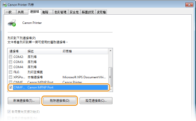 1 | 選擇要刪除的連接埠,然後按一下 [刪除連接埠]。 ![]() ![]() 您無法刪除目前設定為印表機連接埠的連接埠。若要刪除此連接埠,請選擇其他連接埠,並按一下 [套用] 設定為新的印表機連接埠,然後刪除原始連接埠。 |