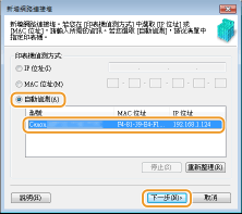 3 | 選擇 [自動偵測],然後選擇偵測到的本機,再按一下 [下一步]。 ![]() ![]() 若未偵測到本機 按一下 [重新整理]。如果問題仍然存在,選擇 [IP 位址] 或 [MAC 位址],輸入本機的 IP 位址或 MAC 位址(檢視網路設定),然後按一下 [下一步]。 |