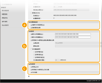 2 | 指定 IPv4 DNS 設定。 ![]() [DHCP選項設定][獲取主機名稱] 勾選此核取方塊以啟用選項 12,從 DHCP 伺服器取得主機名稱。 [DNS動態更新] 勾選此核取方塊以啟用選項 81,透過 DHCP 伺服器動態更新 DNS 記錄。 [獲取DNS伺服器位址] 勾選此核取方塊以啟用選項 6,從 DHCP 伺服器取得 DNS 伺服器位址。 [獲取網域名稱] 勾選此核取方塊以啟用選項 15,從 DHCP 伺服器取得網域名稱。 [獲取WINS伺服器位址] 勾選此核取方塊以啟用選項 44,從 DHCP 伺服器取得 WINS 伺服器位址。 [獲取SMTP伺服器位址] 勾選此核取方塊以啟用選項 69,從 DHCP 伺服器取得 SMTP 伺服器位址。 [獲取POP伺服器位址] 勾選此核取方塊以啟用選項 70,從 DHCP 伺服器取得 POP3 伺服器位址。 [DNS設定][主要DNS伺服器位址] 輸入 DNS 伺服器的 IP 位址。 [次要DNS伺服器位址] 輸入次要 DNS 伺服器的 IP 位址(如果有)。 [主機名稱] 輸入要登錄至 DNS 伺服器的機器之主機名稱的英數字元。 [網域名稱] 輸入機器所屬網域名稱的英數字元,例如「example.com」。 [DNS動態更新] 勾選此核取方塊可在每次變更本機 IP 位址時動態更新 DNS 記錄。指定更新間隔時,在 [DNS動態更新間隔] 文字框中輸入時間(以小時為單位)。 [mDNS設定][使用mDNS] Bonjour 採用的 mDNS(多點傳送 DNS)是使主機名稱與 IP 位址建立關聯的通訊協定(不使用 DNS)。勾選此核取方塊以啟用 mDNS,並在 [mDNS名稱] 文字框中輸入 mDNS 名稱。 |