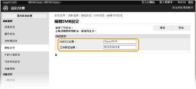 | | 伺服器訊息區 (SMB) 是與網路中多個裝置分享資源(例如檔案和印表機)的通訊協定。本機使用 SMB 將掃描文件儲存到共用資料夾。視網路而定,可能需要設定 NetBIOS 名稱和工作群組名稱。 |