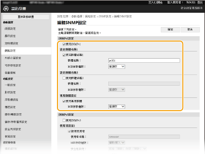 簡易網路管理通訊協定 (SNMP) 是使用管理資訊庫 (MIB) 監控與管理網路上的通訊裝置之通訊協定。本機支援 SNMPv1 和提高安全性的 SNMPv3。列印文件或使用遠端使用者介面時,可以從電腦檢查本機的狀態。您可以啟用 SNMPv1 或 SNMPv3,或是兩者皆啟用。根據網路環境和用途指定各版本的設定。