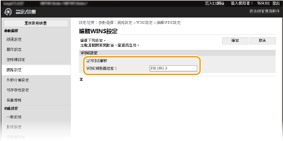 如果從 DHCP 伺服器取得 WINS 伺服器的 IP 位址,取得的 IP 位址優先於在 [WINS伺服器位址] 文字框中輸入的 IP 位址。