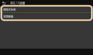 2 | 選擇認證方法。 ![]() <開放式系統> 設定開放式系統認證(又稱為「開放式認證」)。 <共用鍵值> 使用 WEP 鍵値作為密碼。 ![]() 選擇 <開放式系統> 時 連接到無線區域網路時,如果在無線路由器上設定共用鍵値認證,本機將發生認證錯誤。若發生此情況,本機會將設定自動變更為 <共用鍵值>,然後重新嘗試連線。 |