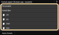 Si l'écran illustré ci-dessus ne s'affiche pas lorsque le papier est chargéSi vous chargez toujours le même papier dans le bac multifonctions, vous pouvez vous épargner les opérations de réglage du format et du type de papier à chaque impression en les définissant par défaut. Notez que si un réglage par défaut est enregistré, l'écran illustré ci-dessus ne s'affiche pas. Pour afficher l'écran, sélectionnez <Spécifier lors du chargement du papier> (Enregistrement des paramètres papier par défaut du bac multifonctions). |