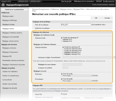 Le sélecteur définit les conditions d'application des paquets IP aux communications IPSec. Les adresses IP, les numéros de port de l'appareil et les périphériques avec lesquels il est possible de communiquer sont autant de conditions sélectionnables.