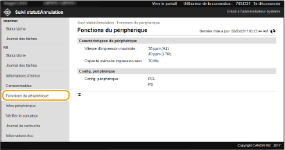 Les informations sur l'appareil et l'administrateur système s'affichent. Le nom de l'appareil et d'autres informations sur l'administrateur système affichés ici correspondent aux informations définies dans [Informations administrateur système] à la page [Gestion de l'utilisateur] ou dans [Réglages infos sur le périphérique] à la page [Gestion du périphérique].