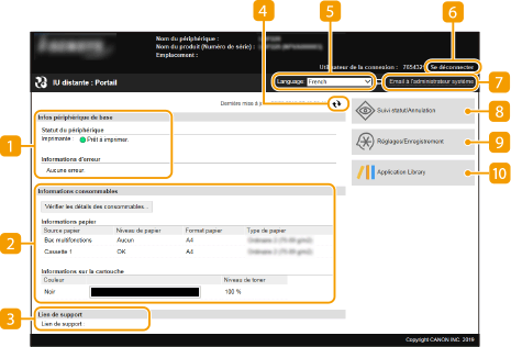 Lorsque vous vous connectez à l'interface utilisateur distante, le page Portail illustrée ci-dessous s'affiche. Cette section décrit les options affichées sur la page Portail et les procédures de base pour l'utilisation de l'interface.