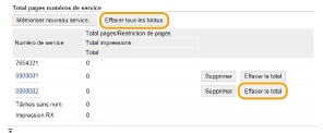 Pour remettre un compteur à zéro, cliquez sur le lien correspondant figurant sous [Numéro de service], puis cliquez sur [Effacer le total]  [OK]. Pour réinitialiser les compteurs de tous les numéros de service, cliquez sur [Effacer tous les totaux]  [OK]. |