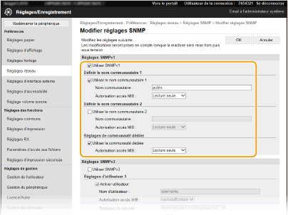 Si les deux versions du protocole SNMP sont activées en même temps, il est recommandé de définir les droits d'accès MIB pour SNMPv1 sur [Lecture seule]. Il est possible de définir différemment les droit d'accès MIB pour les protocoles SNMPv1 et SNMPv3 (ainsi que pour chaque utilisateur dans SNMPv3). Sélectionner [Lecture/Écriture] (tous les droits d'accès) dans SNMPv1 annule les puissantes fonctions de sécurité qui caractérisent SNMPv3, car la plupart des réglages de l'appareil sont alors contrôlés par SNMPv1. |