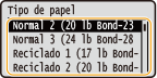 Los tamaños de papel que se registren con el procedimiento anterior se muestran en la pantalla de selección de tamaño de papel para el casete de papel o la bandeja multiuso.