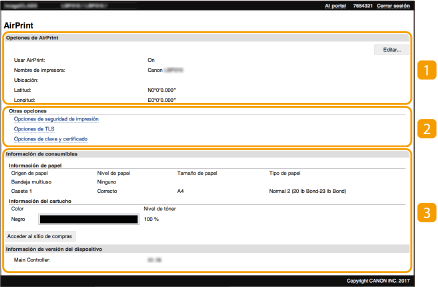 Puede visualizar la pantalla para AirPrint, en la que, además de acceder a las opciones de AirPrint, puede ver la información sobre los consumibles, como el papel y el cartucho de tóner. Además, puede configurar las opciones de las funciones de seguridad.