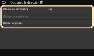 3 | Compruebe que <IP automática> esté establecido en <On>. Si está seleccionado <Off>, cambie la opción a <On>. |
