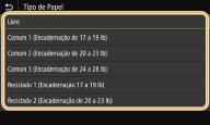Se a tela mostrada acima não for exibida quando o papel for carregadoSe você carrega sempre o mesmo papel na bandeja multiuso, você pode ignorar as operações de configuração de papel registrando o tamanho e o tipo de papel como a configuração padrão. Quando a configuração padrão é registrada, entretanto, a tela mostrada acima não é exibida. Para visualizar a tela, selecione <Especificar ao Colocar Papel> (Registrando as configurações de papel padrão para a bandeja multiuso). |