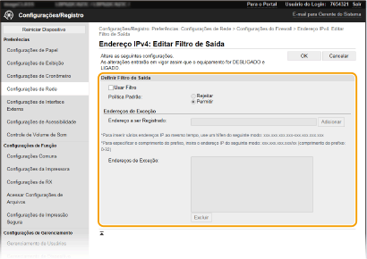 Selecione o filtro que corresponde ao endereço ao endereço IP. Para restringir os dados enviados da máquina para um computador, selecione [Filtro de Saída]. Para restringir os dados recebidos a partir de um computador, selecione [Filtro de Entrada].