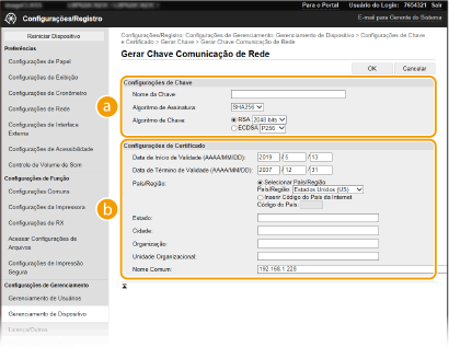 Selecione o algoritmo de geração de chave de [RSA] ou [ECDSA], depois selecione o comprimento de chave da lista suspensa. Em qualquer dos casos, quanto maior for o número do comprimento de chave, maior será o nível de segurança. Contudo, a velocidade de comunicação se tornará mais lenta.