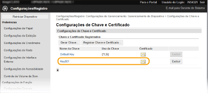 Uma chave e certificado não podem ser excluídos se estiver sendo usado atualmente para alguma finalidade, como quando "[TLS]" ou "[IEEE 802.1X]" está sendo exibido em [Uso da Chave]. Neste caso, desative a função ou substitua a chave e o certificado antes de excluí-los.