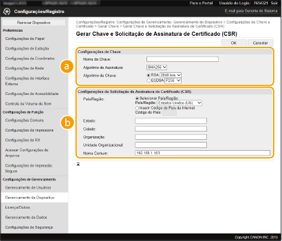 Como os certificados gerados na máquina não têm uma assinatura CA, um erro de comunicação pode resultar dependendo dos dispositivos com os quais ele se comunica. Para que a autoridade de certificação emita o certificado com a assinatura CA, você precisa obter os dados do CSR (Certificate Signing Request), que o administrador pode gerar a partir da Interface Remota. Quando o certificado é emitido, registre-o na chave com o CSR gerado.