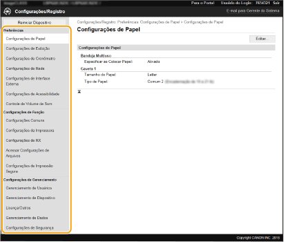 Você pode alterar as várias configurações da máquina usando a Interface Remota. A maioria das configurações também pode ser definida na máquina, mas algumas delas somente podem ser definidas usando a Interface Remota. Esta seção descreve o fluxo básico de alteração das configurações da máquina usando a Interface Remota. A maioria das configurações também pode ser definida na máquina, mas algumas delas somente podem ser definidas usando a Interface Remota.