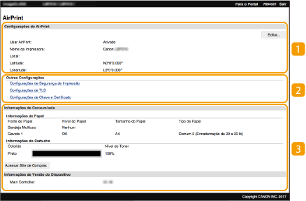 Você pode exibir a tela para AirPrint, na qual pode não só acessar as configurações de AirPrint mas também visualizar informações sobre consumíveis, como papel e cartuchos de toner. Além disso, você pode configurar as definições da função de segurança.
