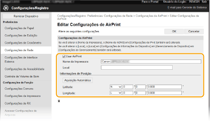 Você pode registrar informações, incluindo o nome da máquina e o local de instalação, usadas para identificar a máquina. Você também pode desabilitar o recurso AirPrint da máquina. Use a Interface Remota para alterar estas configurações.