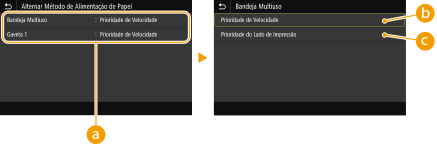 <Bandeja Multiuso> <Prioridade de Velocidade>  <Prioridade do Lado de Impressão> <Gaveta 1> <Prioridade de Velocidade>  <Prioridade do Lado de Impressão> <Gaveta 2>* <Prioridade de Velocidade>  <Prioridade do Lado de Impressão> |