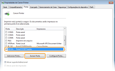 1 | Selecione a porta que deseja excluir e clique em [Excluir Porta]. ![]() ![]() Você não pode excluir uma porta atualmente configurada como a porta da impressora. Para excluir essa porta, selecione uma porta diferente e clique em [Aplicar] para configurá-la como a nova porta de impressora, e então, exclua a porta original. |