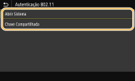 2 | Selecione um método de autenticação. ![]() <Abrir Sistema> Define a autenticação aberta do sistema, também chamada de "autenticação aberta." <Chave Compartilhada> Usa a chave WEP como senha. ![]() Quando <Abrir Sistema> está selecionado Quando você estiver se conectando a uma LAN sem fio, a máquina passa por um erro de autenticação se a chave de autenticação compartilhada estiver definida no roteador sem fio. Se isso acontecer, a máquina altera automaticamente a configuração para <Chave Compartilhada> e tenta conectar novamente. |