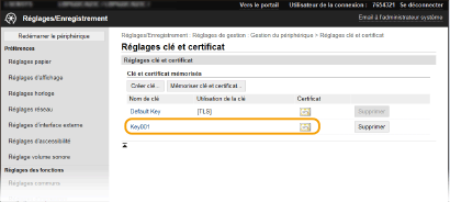 Il est impossible de supprimer une clé avec certificat en cours d'utilisation pour une fonction, comme par exemple lorsque « [TLS] » ou « [IEEE 802.1X] » s'affiche sous [Utilisation de la clé]. Dans un tel cas, désactivez la fonction ou remplacez la clé avec certificat utilisée avant de la supprimer.