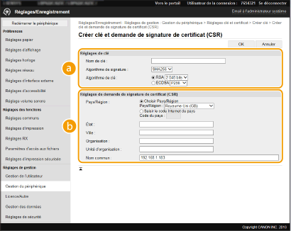 Comme les certificats générés sur l'appareil ne portent pas de signature CA, une erreur de communication peut se produire avec certains périphériques avec lesquels l'appareil communique. Pour qu'une autorité de certification émette le certificat avec une signature CA, vous devez obtenir les données de demande de signature de certificat (CSR), que l'administrateur peut générer depuis l'interface utilisateur distante. Une fois le certificat émis, enregistrez-le sur la clé générée avec la demande CSR.