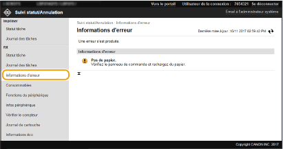 Le format et le type de papier de la source ainsi que le numéro de modèle de cartouche de toner, notamment, sont également affichés. Vous pouvez également cliquer sur [Vérifier les détails des consommables], dans la page du portail (page principale) pour afficher cette page (