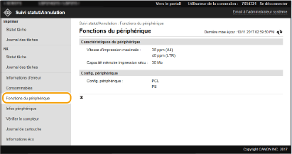 Les informations sur l'appareil et l'administrateur système s'affichent. Le nom de l'appareil et d'autres informations sur l'administrateur système affichés ici correspondent aux informations définies dans [Informations administrateur système] à la page [Gestion de l'utilisateur] ou dans [Réglages infos sur le périphérique] à la page [Gestion du périphérique].