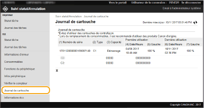 Vous pouvez consulter les journaux sur la consommation des cartouches de toner et les autres journaux.