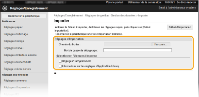 Les données de réglage de l'appareil peuvent être enregistrées sur l'ordinateur (exportation). Les données enregistrées sur votre ordinateur peuvent également être enregistrées sur l'appareil (importation). Comme les données exportées depuis l'appareil peuvent être importées sur d'autres appareils du même modèle, vous disposez d'un moyen simple de copier divers réglages sur plusieurs appareils. Pour utiliser ces fonctions, vous devez vous connecter en tant qu'administrateur système. |
